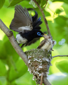 아기 새가 생애 첫 비행을 위해 둥지 위에 올라섰다. 그 모습을 응원하듯 아빠 새가 먹이를 물어다 주고 있다. 전라북도 군산의 한 야산에 둥지를 틀고 번식에 성공한 긴꼬리딱새의 이소(離巢) 현장이다. 삼광조로도 불리는데 파란색 안경을 쓴 것 같은 독특한 모습이 특징이다. 수컷 성조는 길고 우아한 꼬리 깃털을 가지고 있는데, 몸길이의 약 두 배에 달한다. 여름 철새로 5월에서 7월 사이 일본과 우리나라 제주도 및 남부지방에서 번식한 뒤 중국 남부와 동남아시아 등지에서 겨울을 난다. 국제자연보전연맹(IUCN)이 적색목록 취약종(VU)으로 분류하고, 우리나라도 멸종위기야생생물 2급으로 지정해 보호하고 있다. 아기 새는 둥지 부근에서 비행 연습을 하다 독립하는데, 부모 새는 아기 새 주변을 떠나지 않고 이소를 돕는다. 다 자라 집을 떠나는 자식에게 마지막 한 끼를 챙겨주려는 부모 마음은 새나 인간이나 똑같은 듯하다. 2024.06.26. 중앙일보 최기웅 기자.