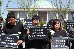 - 전세사기피해자 및 피해대책위원회 활동가들이 서울 영등포구 국회 앞에서 대구 전세 사기 희생자를 위한 '여덟번째 전세사기 희생자 추모 및 대책 마련 촉구 기자회견'을 하고 있다. 2024.05.08 경향신문 한수빈 기자
