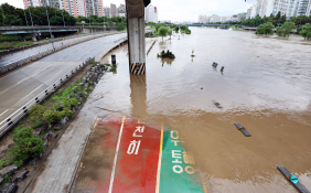 서울 전역에 한때 호우경보가 발효된 서울 노원구 월릉교 인근 동부간선도로가 통제되고 있다.