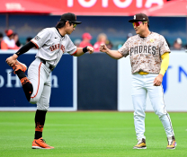 - 미국 캘리포니아주 샌프란시스코 오라클 파크에서 열린 2024시즌 메이저리그 샌프란시스코 자이언츠와 샌디에이고 파드리스의 경기, 경기에 앞서 샌프란시스코 이정후와 샌디에이고 김하성이 인사를 나누고 있다.
