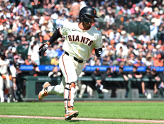 미국 캘리포니아주 샌프란시스코 오라클 파크에서 열린 2024시즌 메이저리그 샌프란시스코 자이언츠와 샌디에이고 파드리스의 경기, 1회말 무사에서 샌프란시스코 이정후가 중전 안타를 치고 1루로 향하고 있다.