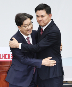 - 국민의힘 새 원내대표로 선출된 권성동 의원(왼쪽)이 서울 여의도 국회에서 열린 원내대표 선출 의원총회에서 김태호 후보의 축하를 받고 있다. 2024.12.12 뉴스1 구윤성 기자