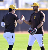 샌디에이고 파드리스 김하성이 미국 애리조나 주 피오리아에서 열린 스프링캠프 현장에서 팀 동료 잰더 보가츠가 캐치볼을 마친 후 하이파이브를 나누고 있다. 2024.02.21 스포츠조선 허상욱 기자