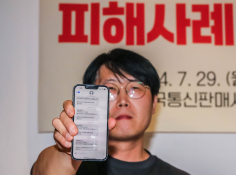 서울 종로구 참여연대에서 열린 '티몬 위메프 사태 피해 입점업체 피해사례 발표 및 대책 촉구 기자회견'에서 김대형 중랑시장 상인회 회장이 위메프광고주센터로부터 온 광고 포인트 충전 실패 문자메시지를 보이고 있다.
