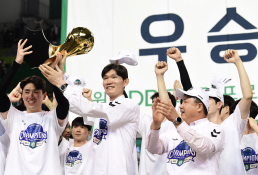 14일 원주종합체육관에서 프로농구 원주 DB와 수원 KT의 경기가 열렸다. DB가 정규시즌 우승을 확정지었다. 김주성 감독을 헹가래 치고 있는 DB 선수들. 원주=송정헌 기자songs@sportschosun.com/2024.03.14/