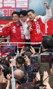 서울 동대문에서 국민의힘 지지자들이 한동훈 비상대책위원장의 지원 유세를 보며 손을 흔들고 있다. 2024.4.4 연합뉴스 한상균 기자