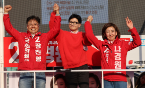 국민의힘 한동훈 비상대책위원장이 서울 동작구 이수역에서 나경원 후보 지원유세를 하고 있다. 왼쪽은 장진영 후보. 2024.4.5 연합뉴스 한상균 기자