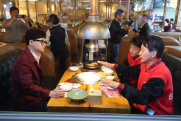 국민의힘 한동훈 비상대책위원장이 인천 계양구 한 고깃집에서 원희룡 후보와 만나고 있다. 원 후보 옆은 이천수 전 축구 국가대표.