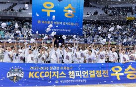 - 경기도 수원시 권선구 수원KT소닉붐아레나에서 열린 '2023-2024 정관장 프로농구' 챔피언결정전 5차전 수원 KT와 부산 KCC의 경기에서 우승을 차지한 KCC 선수들이 기념촬영하고 있다.