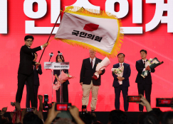 - 당기 흔드는 한동훈 대표한동훈 국민의힘 당대표가 경기 고양시 킨텍스에서 열린 제4차 국민의힘 전당대회에서 당대표에 선출된 후 당기를 이양받아 흔들고 있다.2024.07.23 뉴시스 고승민 기자