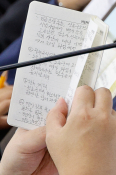 조규홍 보건복지부 장관이 서울 여의도 국회 보건복지위원회에서 열린 보건복지부·질병관리청·식품의약품안전처 등 종합 국정감사에 출석해 자필로 쓴 수첩 메모를 보며 질의에 답하고 있다. 서울대병원 노동조합이 무기한 전면 파업을 결정한 것과 관련 '필수유지 업무-노동조합 및 노동관계조합 법령에 따라 파업이 진행되더라도 필수유지 업무는 유지할 의무, 향후 계획-진료공백 최소화' 등이 적혀 있다. 2024.10.23 뉴스1 안은나 기자